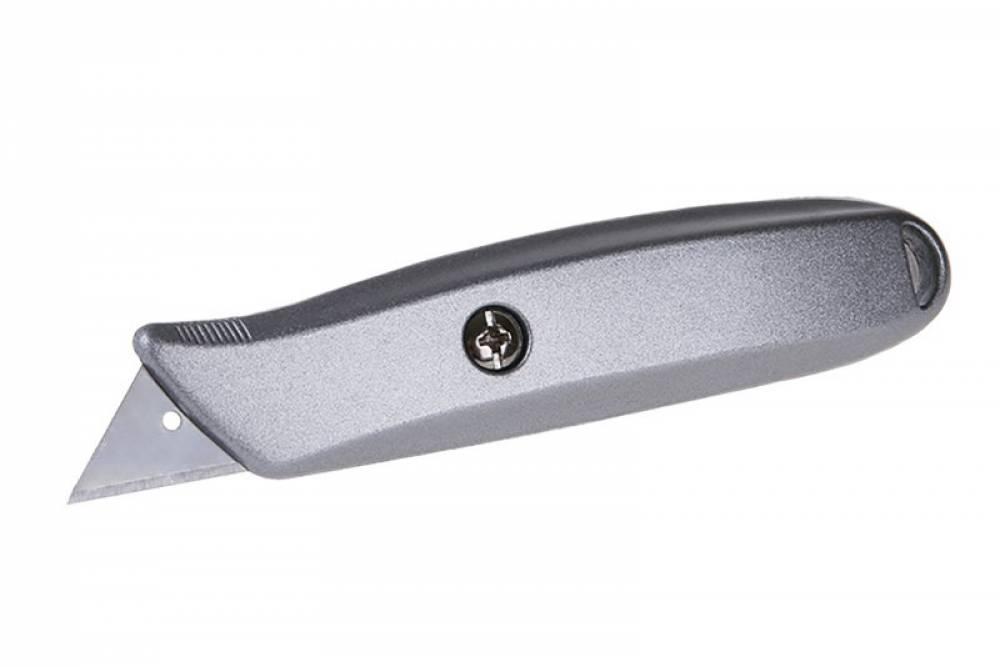 Kovový nôž s pevne uchytenou lichobežníkovou čepeľou, čepeľ uchytená vo vnútri tela noža.