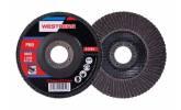 Lamelový kotúč, zrnitosť: 60; druh zrna: oxid hlinitý; spojivo: umelá živica; podkladový materiál: pružná tkanina - 100% bavlna (240-260g / m2); prevedenie: vyhnutý; otvor: Ø 22,2mm, max. pracovná rýchlosť: 80m / s, max. prípustné otáčky: 13300 1 / min, použitie: brúsenie, obrusovanie, odstraňovanie hrdze, odstraňovanie náterov, ...., rozmery: uvedený v názve výrobku.