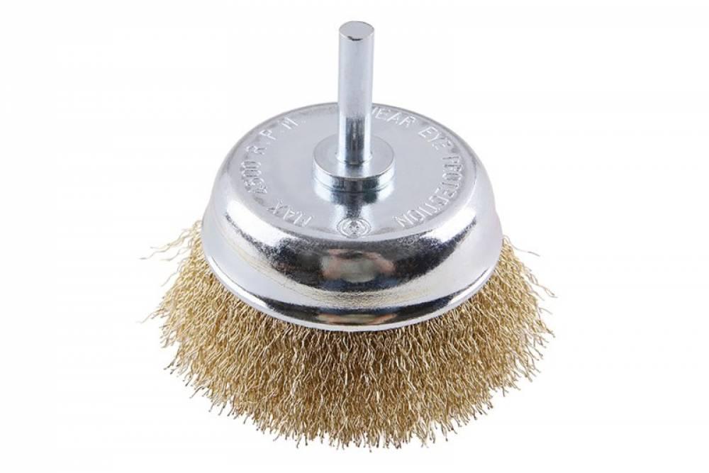 Rotačná kefa - hrnčeková, prevedenie: vlnitý drôt 0,25 mm - pomosadzený, priemer Ø 68 mm, stopka 6 x 27 mm, pozinkované telo kefy, počet drôtov: 1728, dĺžka drôtu: 19 mm, max. prípustné otáčky: 4500 1 / min, použitie: pre leštenie, zdrsňovanie, ostranenie hrdze a otrepov,