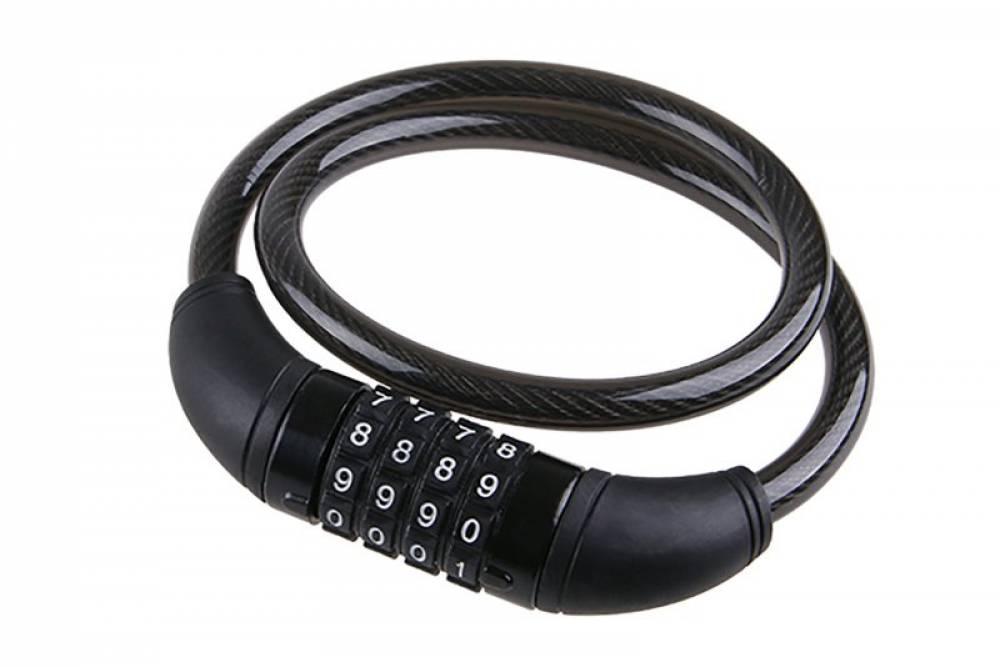 Ľahko prenosný. Uzamykanie na kód pomocou kombinácie 4 čísel. Ľahko pripevniteľný ku kolesu pre prepravu. materiál: flexibilné vinuté oceľové lanko potiahnuté vinylom.