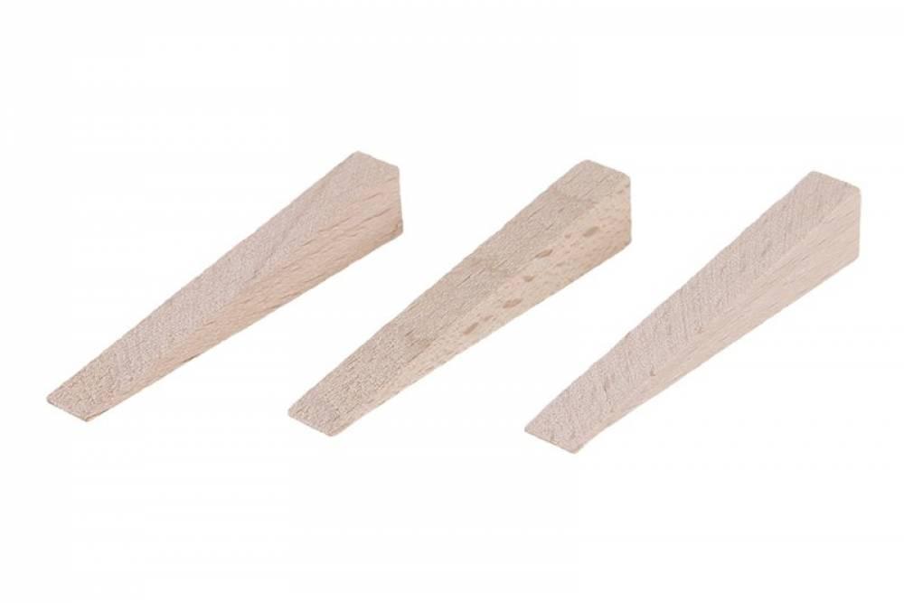 Drevené klinky, rozmer: 55 x 8 x 0-10 mm, vyrobené z tvrdého bukového dreva, množstvo: 250 ks, použitie: na zabezpečenie rovnakej šírky a línie škár pri obkladaní a dláždení balenia: blister s eurootvorom.