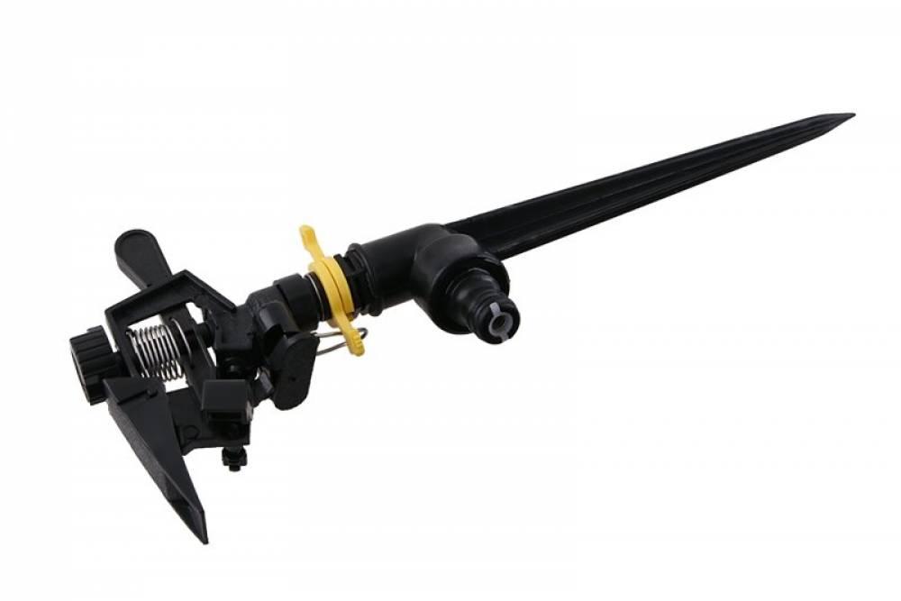 Impulzní jednocestný hrotový zavlažovač s přípojením hadicovou rychlospojkou, min.70 kPa a max.550 kPa.
