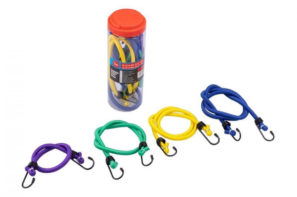 Sada klasických elastických popruhov s oceľovými hákmi. 2 x dĺžka 0.4, 0.6, 0.8, 1 m. Sú určené na fixáciu predmetov. Popruh je tvorený z gumových vlákien potiahnutých opletom zo syntetickej elastickej tkaniny.